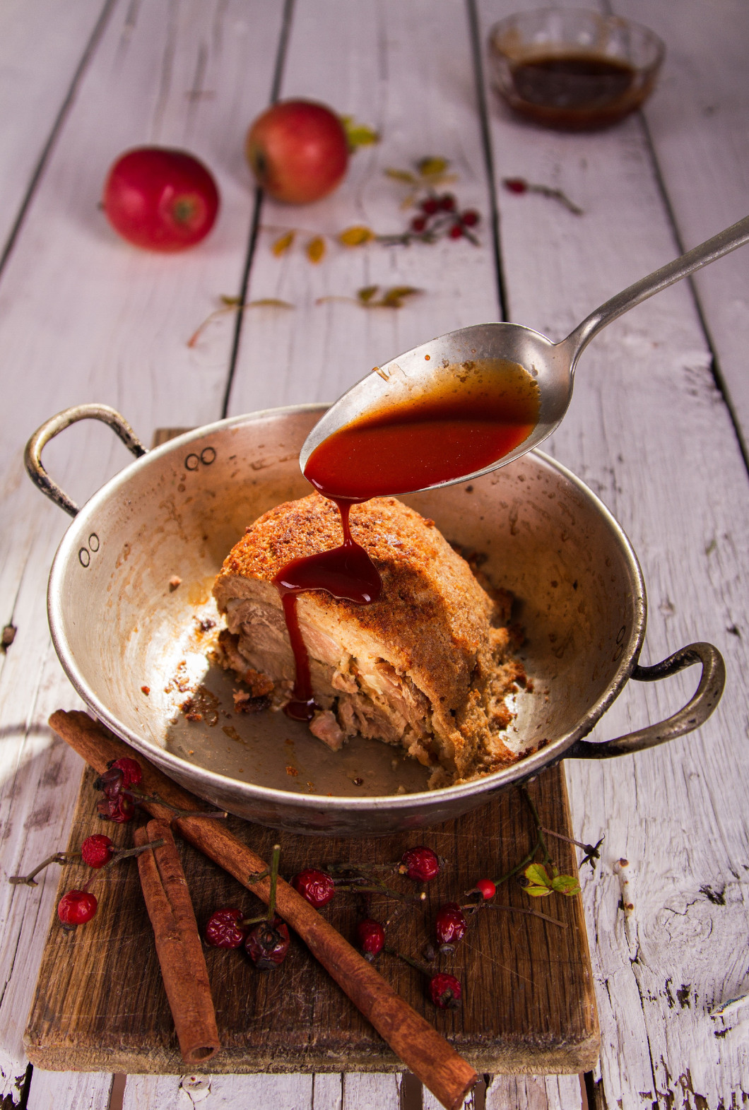 A húst megmossuk, szárazra töröljük, sóval bedörzsöljük. Tűzálló tálba tesszük, leöntjük a forró alaplével és előmelegített sütőben, fedő alatt puhára pároljuk. Ha megpuhult, a szaft felét leöntjük. A fahéjat a cukorral elkeverjük, és a felét a húsra hintjük. A zsemlemorzsát a borba áztatjuk, majd a puha vajjal és a tojásokkal összedolgozzuk, a fahéjas cukorral ízesítjük. Ezt a keveréket a húson szépen elegyengetjük és a forró sütőben rásütjük. A félretett szaftot a csipkebogyólekvárral sűrűre főzzük és a felszeletelt hús mellé tálaljuk.