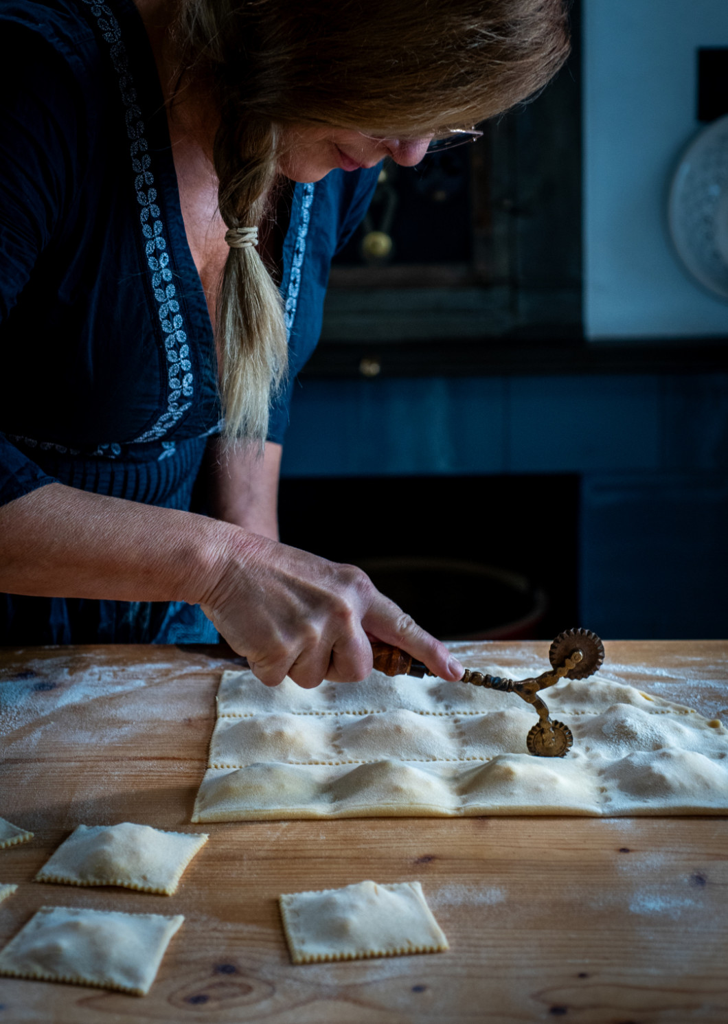 Ha a tésztánk pihent, lisztezett deszkán elkezdjük kinyújtani. Ha már kellőképpen vékony (3-4 mm), gondolatban megfelezzük, majd a túrós töltelékből halmokat rakunk az egyik felére. A halmok között egy ecset segítségével megkenjük vékonyan vízzel. Ezután a tészta másik felét óvatosan ráhajtjuk a halmokra.