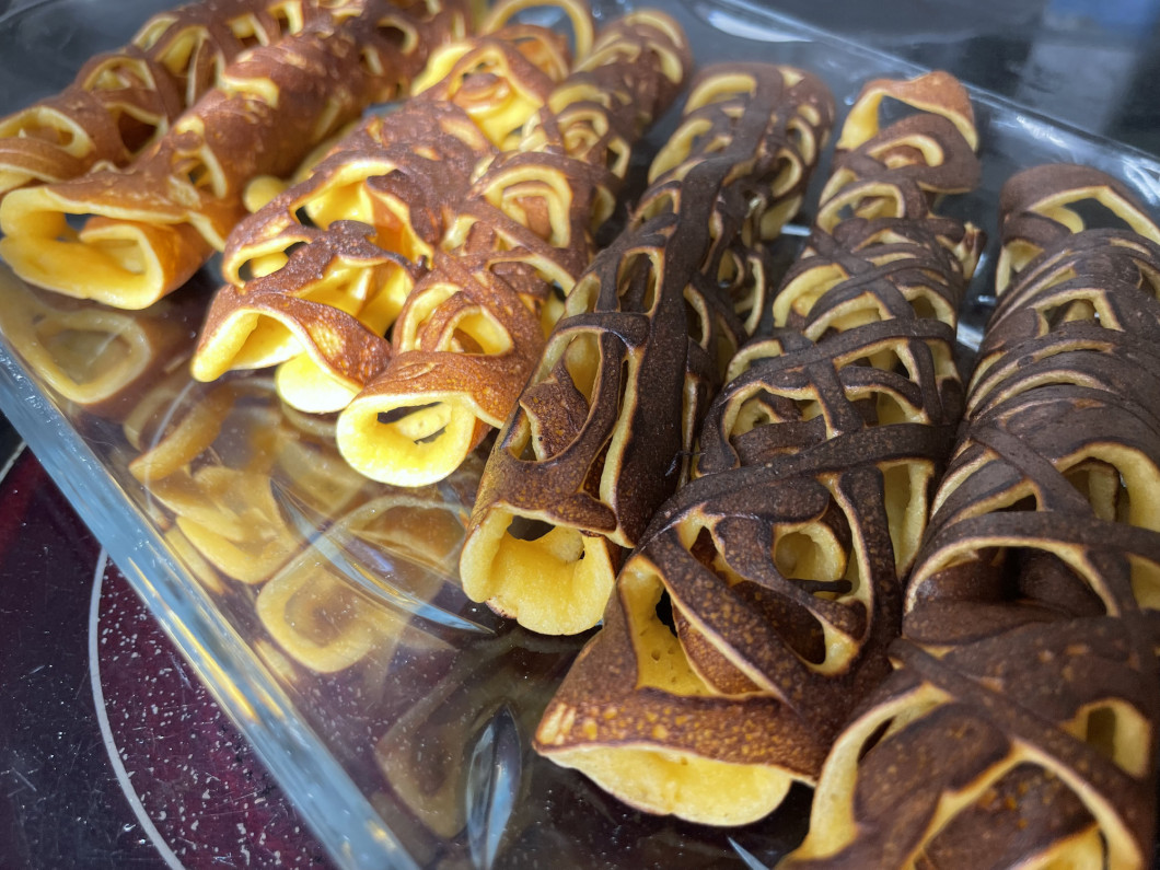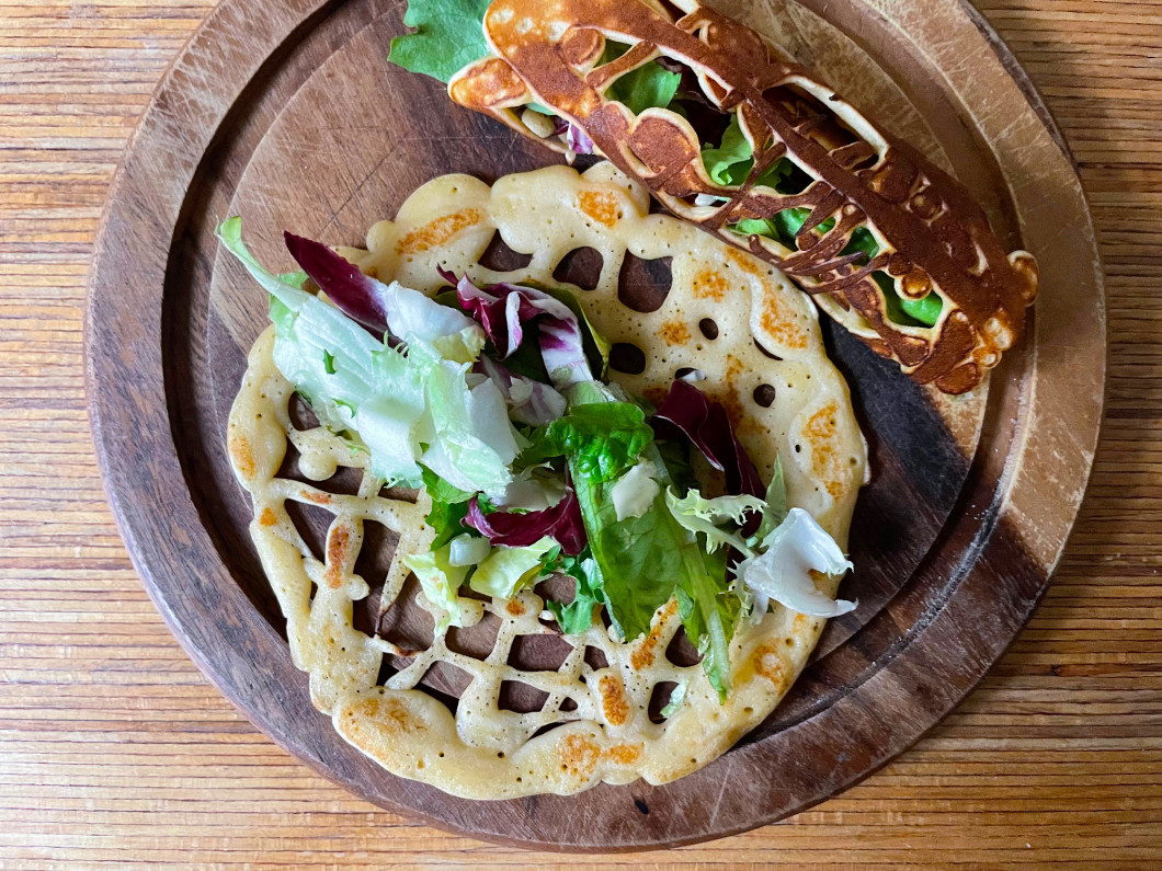 Egy kisebb, kiolajozott serpenyőt felforrósítunk és a masszából áttört „csipkemintát” rajzolunk bele, vagyis minden irányban berácsozzuk. Ha a széle kezd aranyszínűvé válni, megfordítjuk, és a másik oldalát is megsütjük.