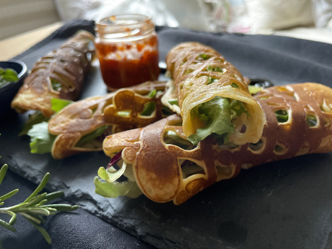 A kész áttört palacsintákat megtöltjük salátalevelekkel és lazán felgöngyöljük. Külön tálkákban többféle mártogatót kínáljunk mellé.