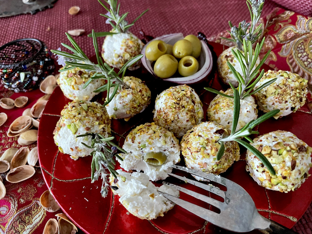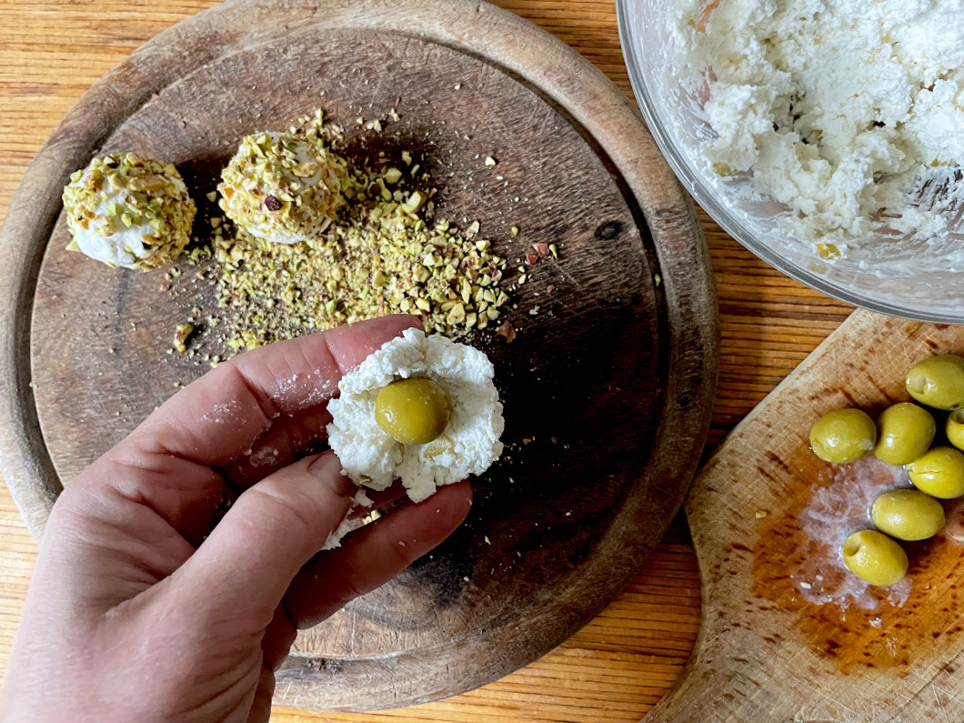 Mindegyik közepébe egy-egy olajbogyót nyomunk, majd egyenként durvára vágott pisztáciában meghengergetjük.